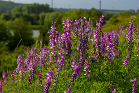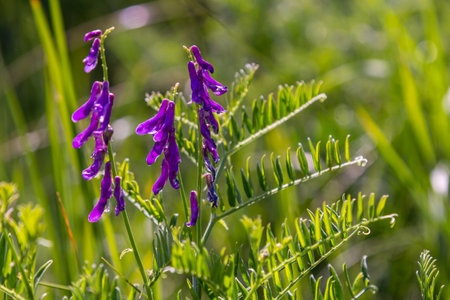 A close-up of Vicia cracca displays its striking purple flowers among lush green foliage thriving in a meadow environment during late spring sunshine.