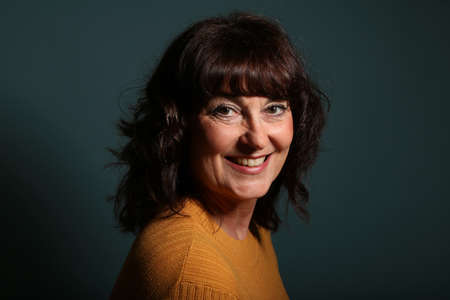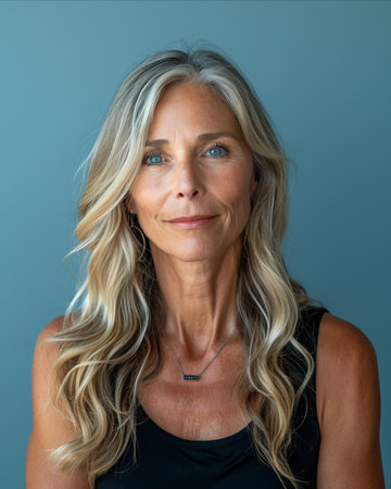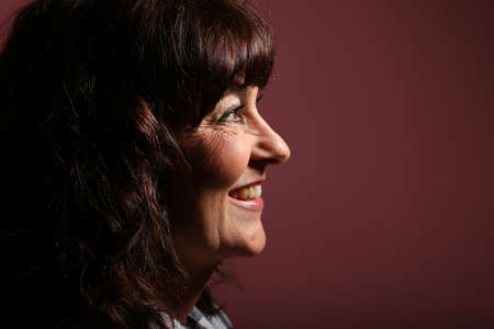 An engaging mature woman with a vivacious expression poses against a purple backdrop