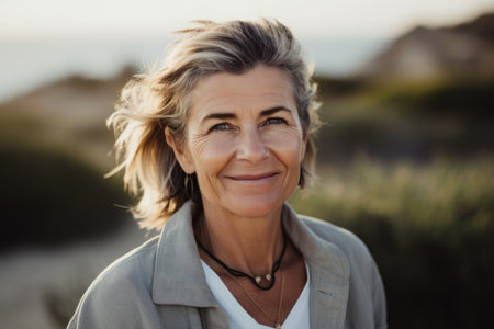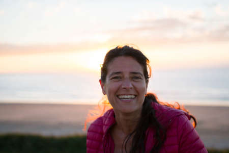 Portrait of smiling mature woman standing on beach at sunset in the countryside