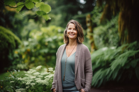 Outdoor portrait of beautiful middle aged woman smiling at camera in the garden.
