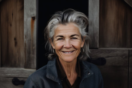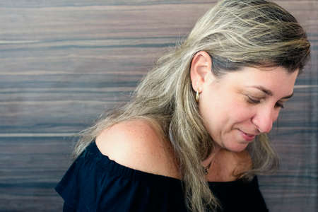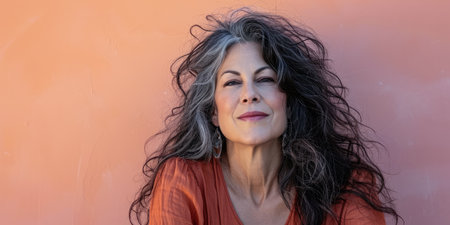 Portrait of a graceful mature woman with striking grey hair and a contemplative expression