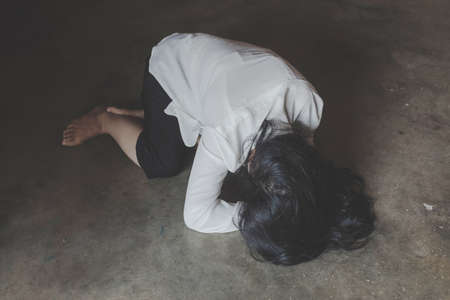 Depressed teenager sitting holding head in hands, stressed sad young woman having mental problems, Abusive and rape, Domestic Violence and Trafficking