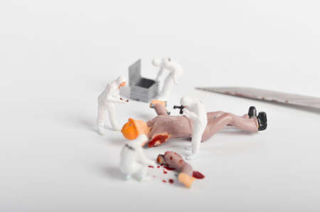Miniature people ; Crime Scene Investigation with fake blood and knife for murder case concept. Selective focus.