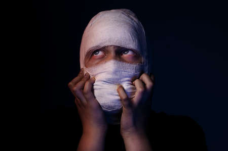 Dark portrait of an infected sick girl with a bandage on her head