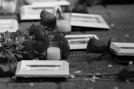 Black and white photo of a bouquet of red roses, and a candle on a wooden table