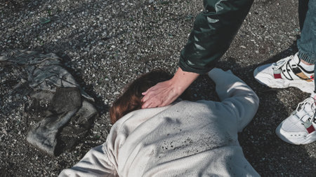 man are using force to coerce woman. scared woman lift hand up for say stop, to protect herself. stop domestic violence against women and anti human trafficking campaign, rape.