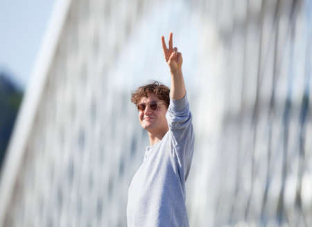 Young Man Standing on the Bridge Making V-sign