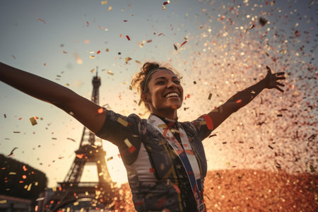 Portrait of a happy athlete celebrating winning success with France, Paris Eiffel tower background