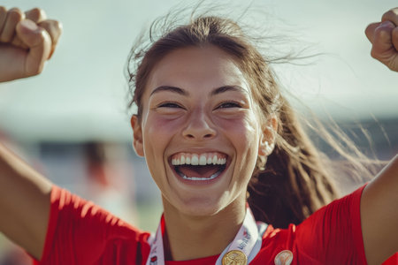 Joyful female athlete celebrating a hard earned victory while proudly holding her medal at an event