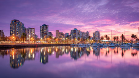 A breathtaking view of a city skyline during sunset, showcasing vibrant colors reflected in calm water. The scene captures urban beauty at dusk.