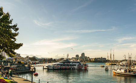 Victoria Canada July. 27, 2019: Enjoy a relaxed stroll on the boardwalk around the Inner Harbor of city of Victoria, steps from waterfront attractions, the landmark Parliament Buildings,