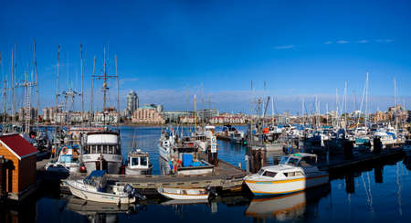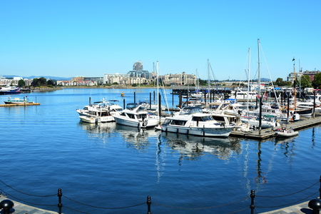 Modern yachts in inner Harbor Afternoon, Victoria, BC. Victoria's Inner Harbor and marina in downtown Victoria. Street view, travel photo, selective focus, nobody, copy space for text