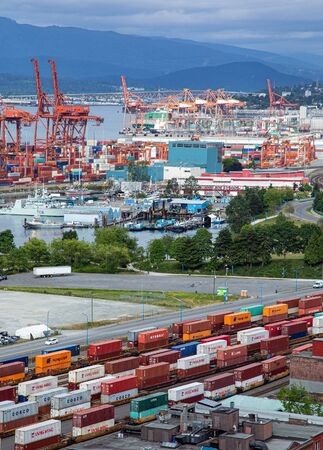 VANCOUVER, CANADA - OCTOBER 28, 2018: Centennial Terminals is a major commercial dock with container cranes and heavy lift machinery.