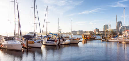 Downtown Victoria, Vancouver Island, British Columbia, Canada - August 18, 2021: Sailboats parked at a marina in a modern city park. Sunny Summer Sunset.