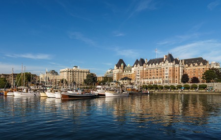 Inner harbor at the morning light. Summertime in Victoria Harbor, British Columbia, Canada-July 21,2021. Street view, travel photo, selective focus, concept photo tourism