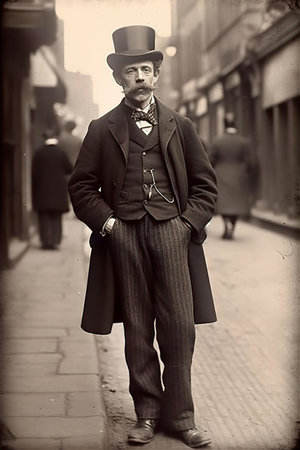 English man pousing on city street, 1890 vintage photo, Generative AI