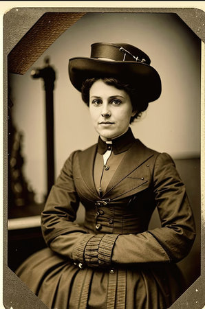 an old-fashioned woman with a victorian-style hat, depicted in a feminine sticker art style. the detailed engraving captures the essence of 19th-century portraitures, with a color palette of light red and brown. this editorial illustration, reminiscent of associated press photos, showcases the timeless elegance of the era. ai generated