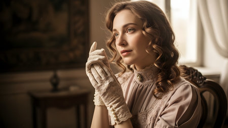 A cinematic portrait of a beautiful woman wearing a vintage pink lace dress and gloves, posing elegantly near a window. The soft lighting and historical attire create a romantic, Victorian or Edwardian era atmosphere.