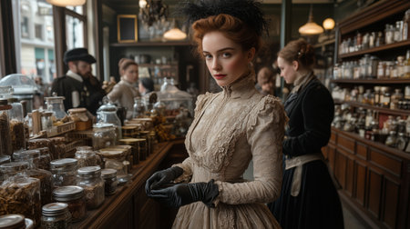 Bustling 19th century store interior in chicago featuring classic fashion and vintage goods.