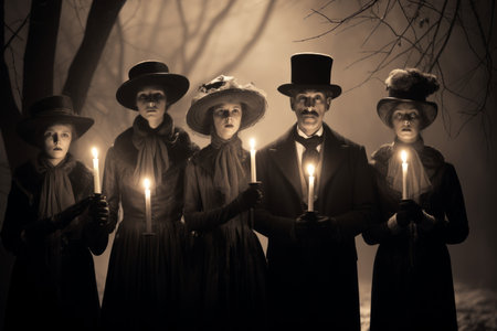 Vintage black and white family portraits frame rustic mantel with antique decor, candles, intricate frames, dim lighting