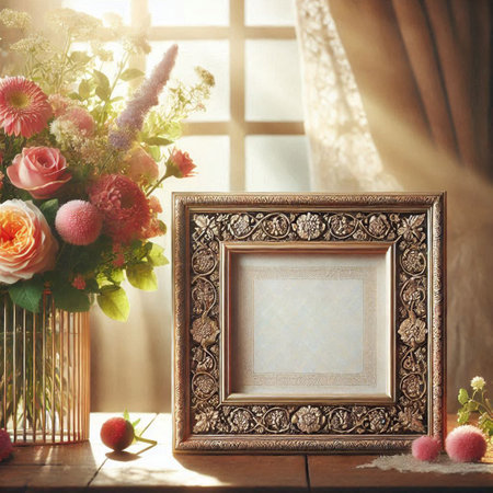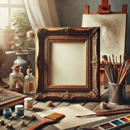 A stunning ornate gold picture frame positioned against a vintage wall, beautifully lit by soft natural light, providing an empty canvas ready for creative expression and artistic display.