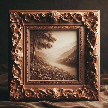 Close-up shot of an ornate wooden picture frame featuring intricate carvings and a vintage texture, perfect for enhancing home d