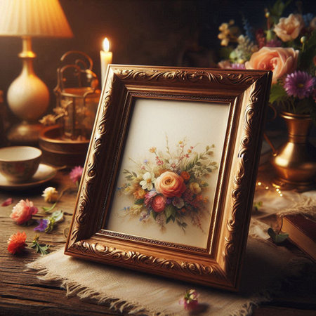 Vintage photo frame with flowers on wooden table. Mockup for design