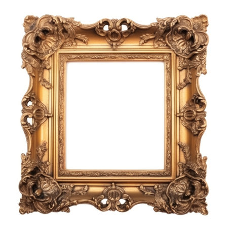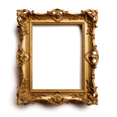 Ornate gold vintage photo frame, isolated on a smooth gray background, highlighting its intricate craftsmanship and regal design