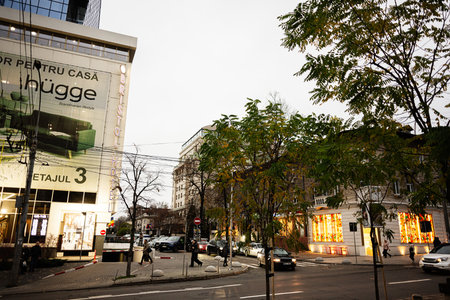 Chisinau, Moldova - November 22, 2025: Busy street in Chisinau Moldova with cars, pedestrians, storefronts and green trees.