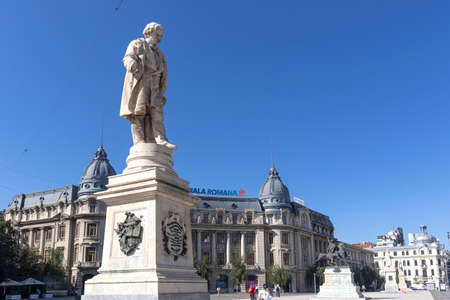BUCHAREST, ROMANIA - AUGUST 17, 2021: Statue of Carol I in front of University Library in city of Bucharest, Romania