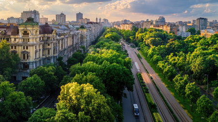 A stunning aerial view capturing the vibrant cityscape harmoniously blended with lush green trees, creating a tranquil environment filled with sunlight.