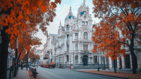 Beautiful Old Building with Exquisite Architecture, Adorned with Vibrant Autumn Leaves in the City
