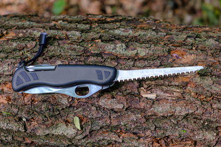 Swiss Soldiers Knife, standard army issue model with extended saw blade on tree trunk in forest