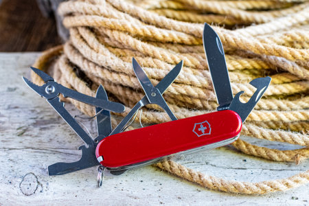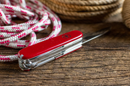 Multipurpose Swiss army knife and rope close-up. A reliable tool for hiking.