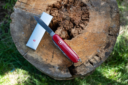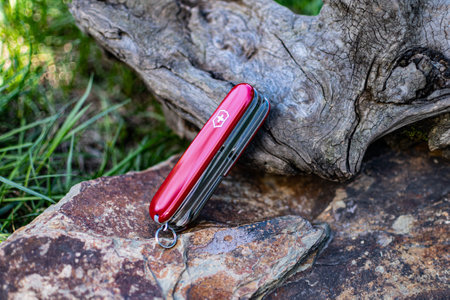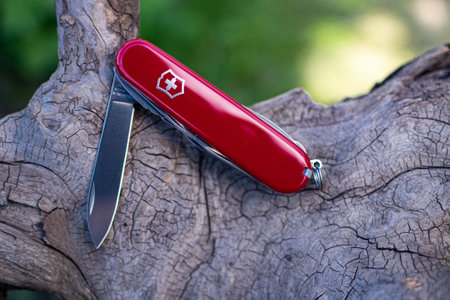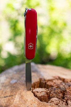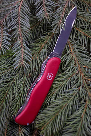 View of closed red Victorinox classical swiss pocket foldable knife in the forest. Close-up.