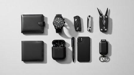 An assortment of black accessories, including a watch, wallet, and phone, are arranged on a white backdrop. The objects showcase a sleek, modern aesthetic with a minimalist composition. The lighting is bright and even, highlighting the textures and forms. Suitable for various commercial projects and editorial needs.