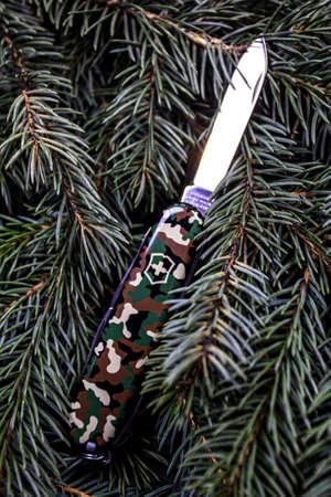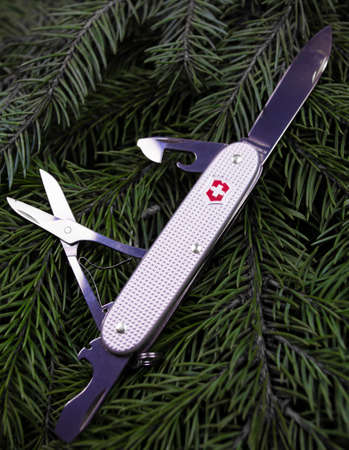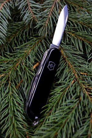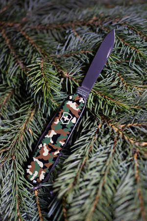 Swiss army folding knife in the forest. Close-up.