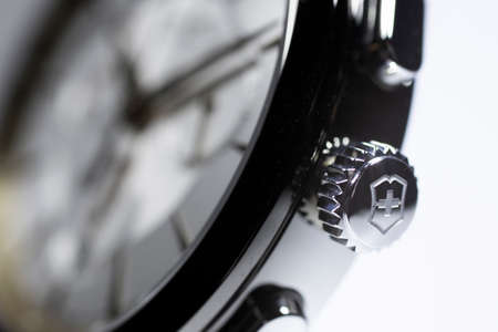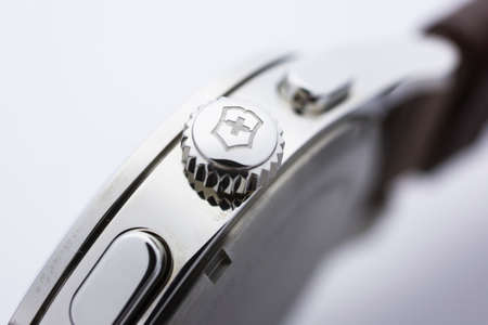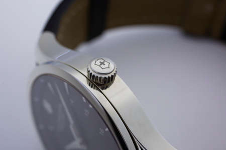 Ibach, Switzerland 31.03.2020 - The close up of Victorinox man watch stainless steel case leather strap swiss quartz mechanical watch swiss made manufacture isolated