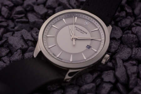 Ibach, Switzerland 31.03.2020 - The close up of Victorinox man watch stainless steel case leather strap grey clock face dial swiss quartz mechanical watch swiss made manufacture lying on grey stones