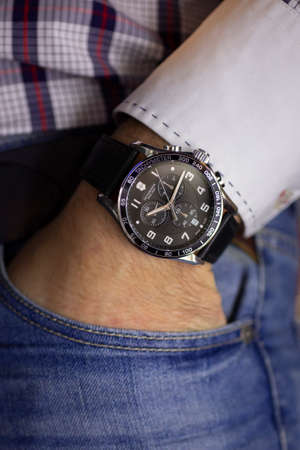 Ibach, Switzerland 31.03.2020 - Closeup fashion image of Victorinox watch on wrist of man: mans hand in blue jeans pocket with white cuff of plaid shirt. Victorinox man watch stainless steel case, black clock face dial leather strap swiss quartz watch swi