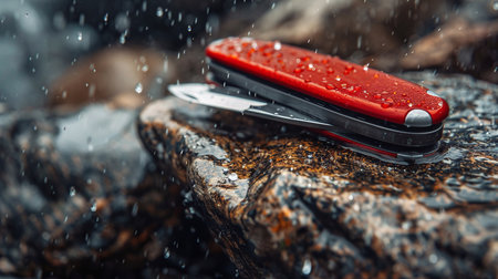 Red pocket knife on a stone in the rain. Selective focus.