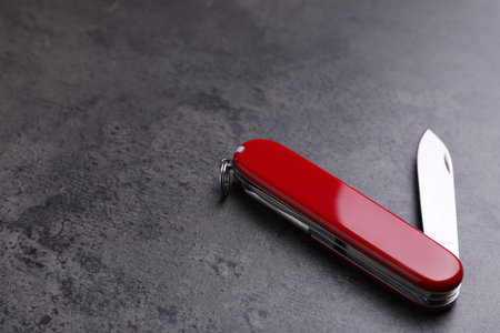 Modern compact portable multitool on gray table. Space for text