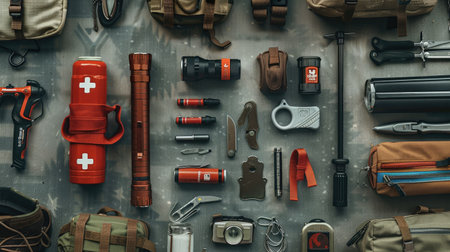 Various items for emergency preparedness arranged on a neutral background, highlighting essential tools for safety, first aid, and survival situations.