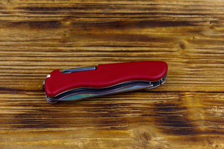 Red all purpose pocket knife on a rustic wooden background. Top view