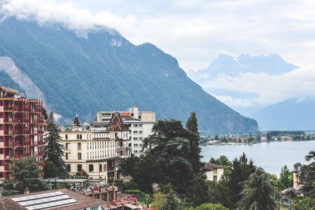 Cityscape of famous Montreux in Switzerland on a foggy day. Buildings by beautiful Lake Geneva, Swiss Alps in the background. Popular tourist destination, Swiss Riviera.