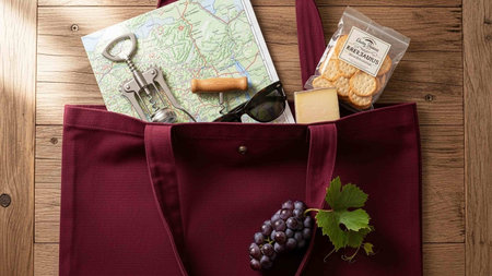Top view of red bag with wine, cheese, grapes and map on wooden background