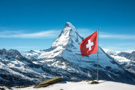 Majestic Swiss Flag Flapping Proudly with Stunning Matterhorn View in Beautiful Summer Landscape