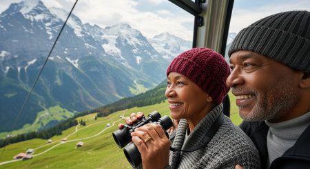 Smiling older couple observing mountain scenery together from a cable car, enjoying nature and panoramic alpine landscape views.