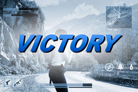 A Glowing digital text Victory with futuristic background, symbolizing success, winner, and triumph in high tech environment