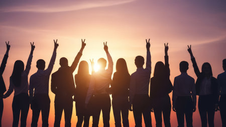 Peace out or fighting metaphor two fingers hand sign in front of a sunset. Happy people enjoying nature.